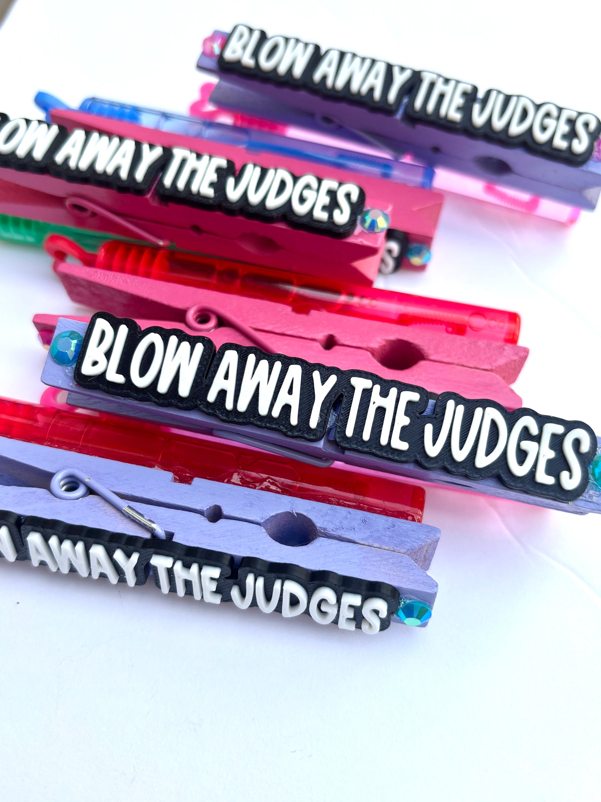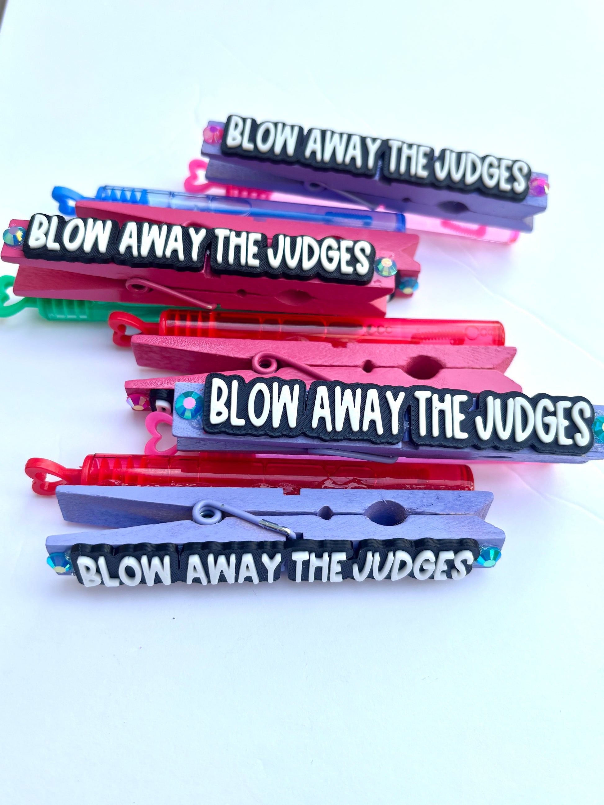 Each over-the-top pin is handcrafted with love and attention to detail. Whether you pin teammate or keep to put on your own bag, they’re the perfect keepsake! Each pin measures approximately 4”L x 1/2”W. Made with standard wooden clothespins, spray painted and sealed and embellishments are secured using E6000 glue.